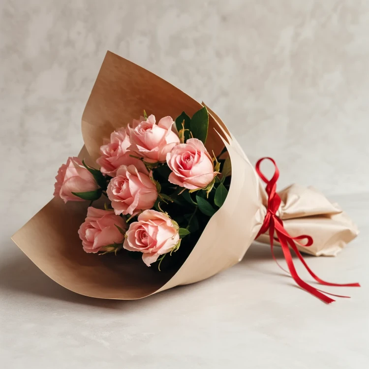 Упакованный в спокойную крафтовую бумагу, букет выглядит стильно и естественно, подчеркивая естественную красоту цветов. Такой подарок станет идеальным выражением чувств на любом празднике — от дня рождения до романтического свидания.